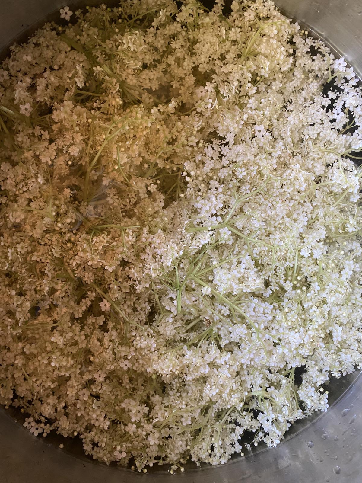 Die Blütenstängel abschneiden, Dolden säubern (nicht waschen wegen Aromaverlust!) und in ein 5-Liter Gefäß geben. Das Wasser samt dem Zucker solange aufkochen, bis sich der Zucker aufgelöst hat. Die Zitronen in Scheiben schneiden und hinzufügen. Eine Tasse von der Zuckerlösung abnehmen und die Zitronensäure darin auflösen. Anschließend wieder zurückgeben zur restlichen Zuckerlösung. Jetzt gut verrühren und vorsichtig über die Holunderblüten gießen. 5 Tage zugedeckt stehen lassen.